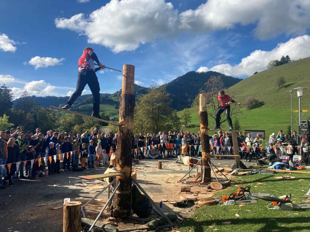 Männer wie Tannen zeigen ihr Geschick mit der Kettensäge und mit der Axt. Der Axeman Club Nordostschweiz demonstriert die 6 Disziplinen der Stihl-Timbersports Series®